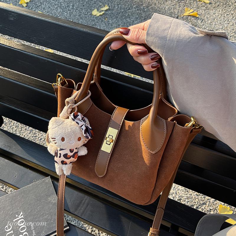 秋冬季爆款麂皮绒包包女2025新款百搭斜挎包撞色手提水桶包小拎包