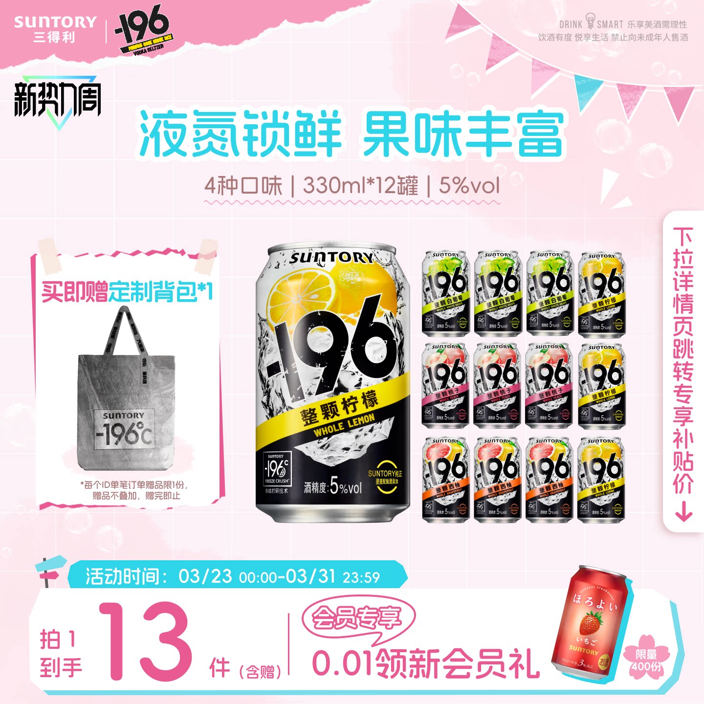 下拉详情领优惠|三得利-196℃预调鸡尾酒微醺低度鸡尾酒6罐果酒