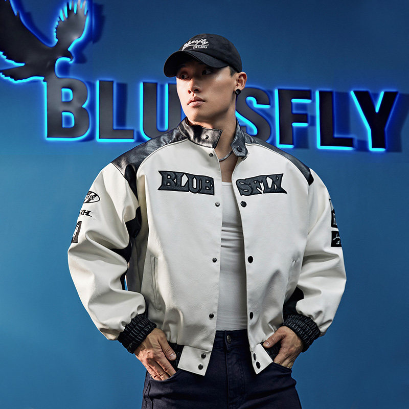 BLUESFLY美式棒球服皮衣机车夹克外套男夹棉冬季潮牌运动休闲高级
