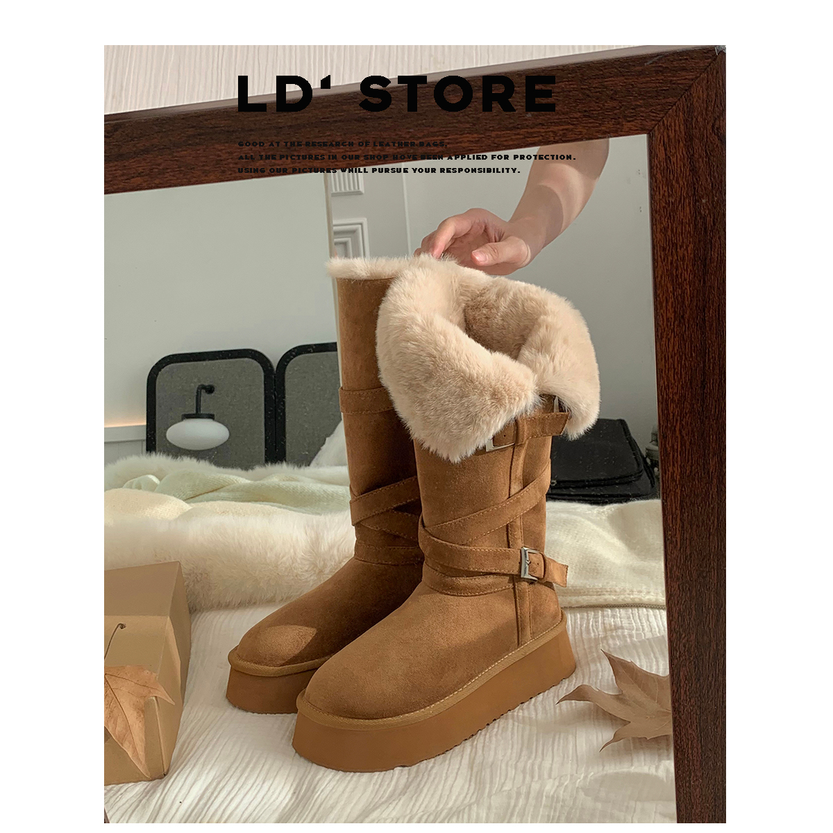 厚底毛毛雪地靴女2025新款冬季加绒加厚保暖长筒皮带扣高筒棉靴女