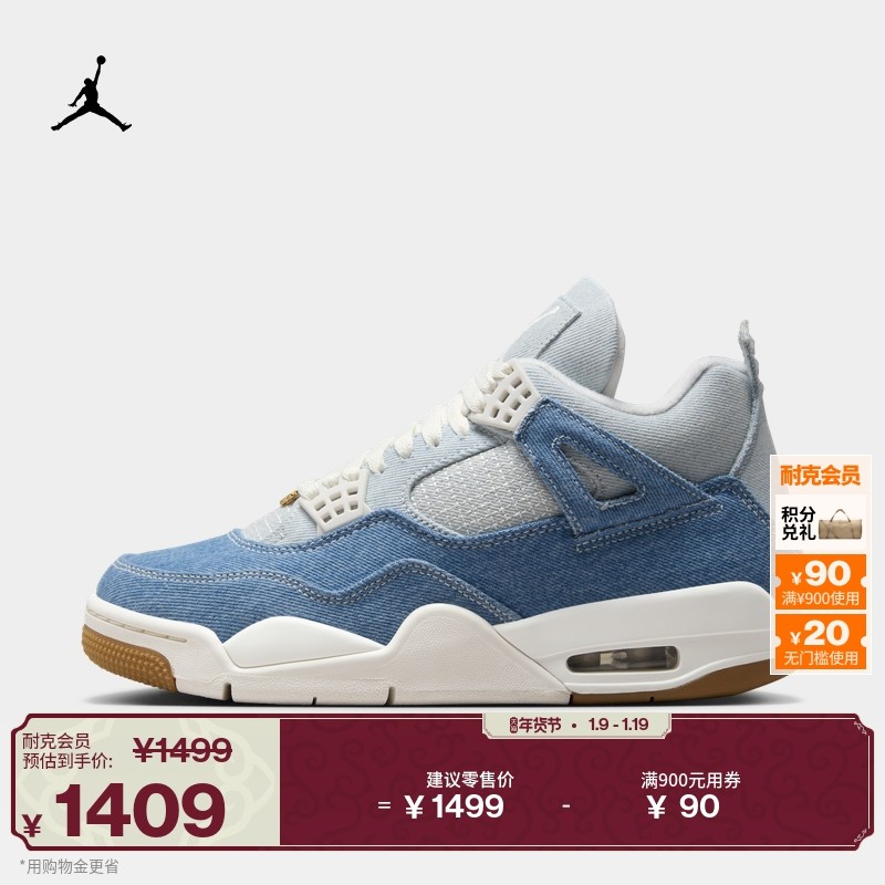 耐克乔丹女子AJ4混搭牛仔布休闲鞋缓震轻便运动鞋JORDAN IB6716