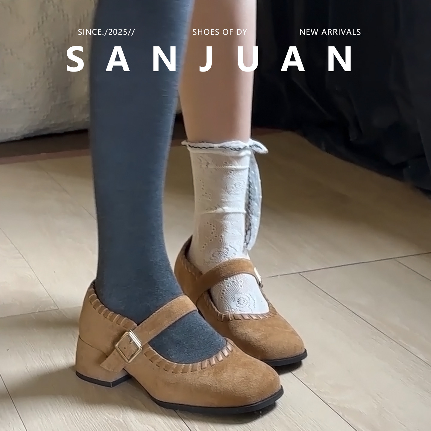 羊皮版sanjuan三卷玛丽珍高跟鞋粗跟方头单鞋内增高乐福鞋小个子