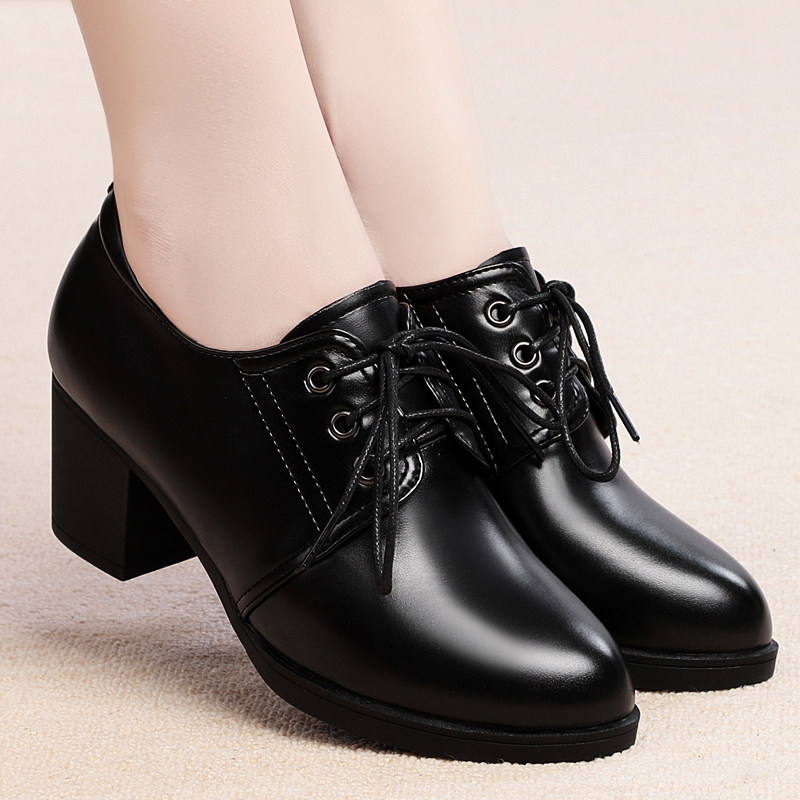 春季新款单鞋黑色高跟鞋粗跟英伦风小皮鞋女士工作鞋真皮系带女鞋