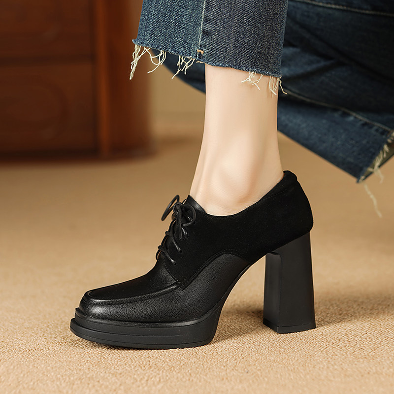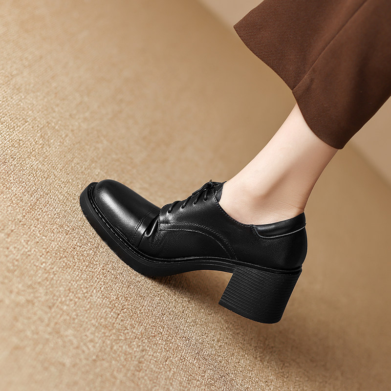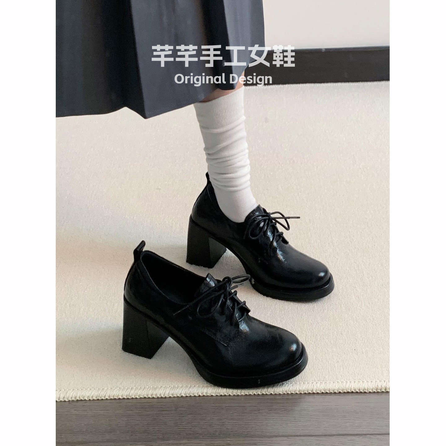 粗跟单鞋女2023新款春秋英伦风女鞋圆头系带高跟牛皮黑色小皮鞋女