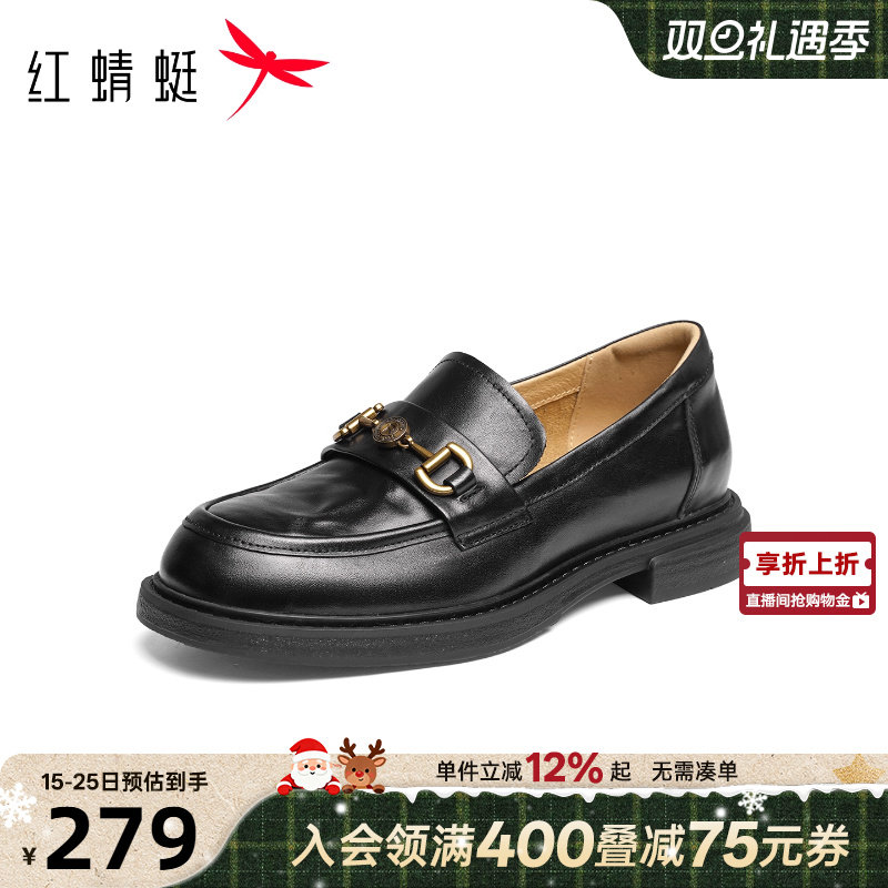 红蜻蜓真皮乐福鞋女2026春新款女鞋黑色粗跟通勤单鞋英伦风小皮鞋