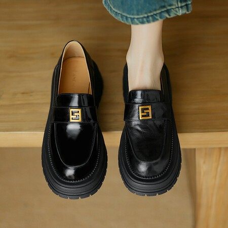 气质拿捏~真皮厚底金币乐福鞋女英伦风一脚蹬黑色小皮鞋粗跟单鞋