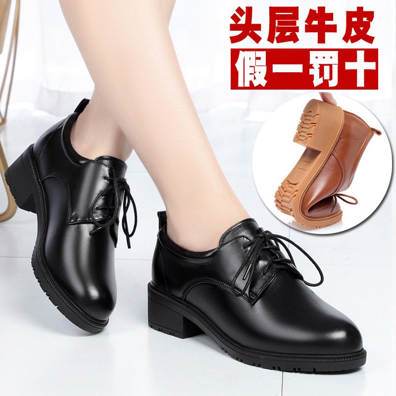 粗跟单鞋女2021春款中跟系带真皮软底圆头黑色小皮鞋女英伦风女鞋