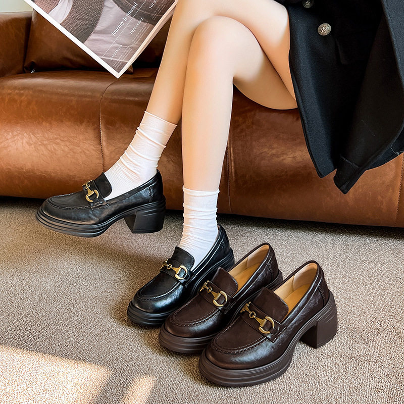真皮厚底乐福鞋女英伦风黑色粗跟小皮鞋通勤女鞋jk制服深口单鞋