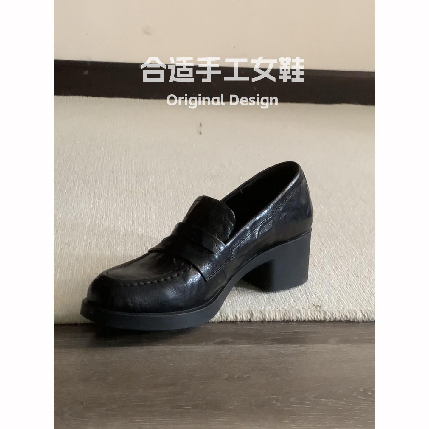 羊皮版~真皮粗跟乐福鞋女复古高跟单鞋黑色英伦风小皮鞋大码女鞋