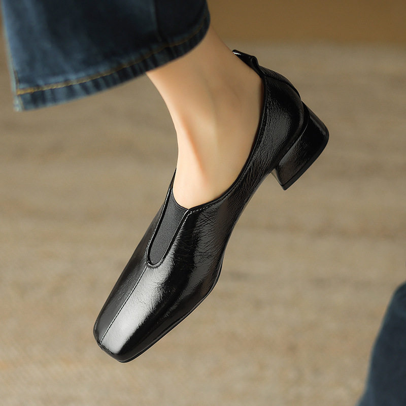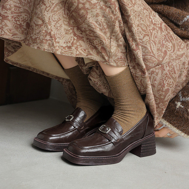 曾小邪复古英伦风真皮方头粗跟乐福鞋女黑色通勤单鞋一脚蹬小皮鞋