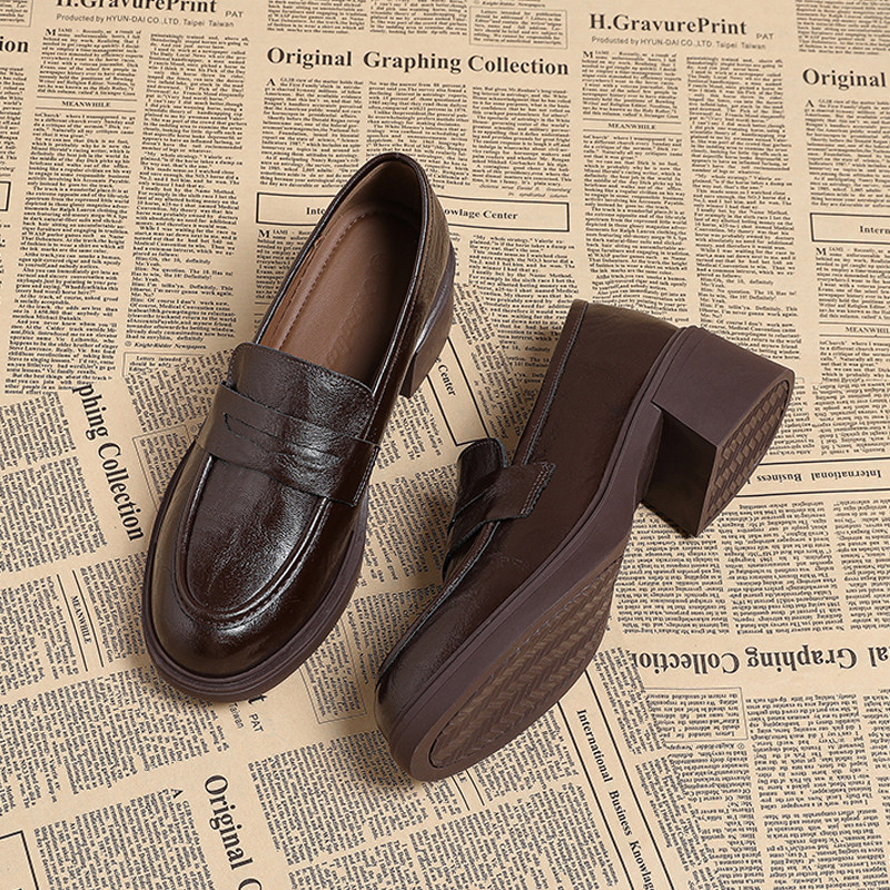 牛皮版复古英伦风圆头粗跟乐福鞋女厚底黑色一脚蹬小皮鞋真皮单鞋