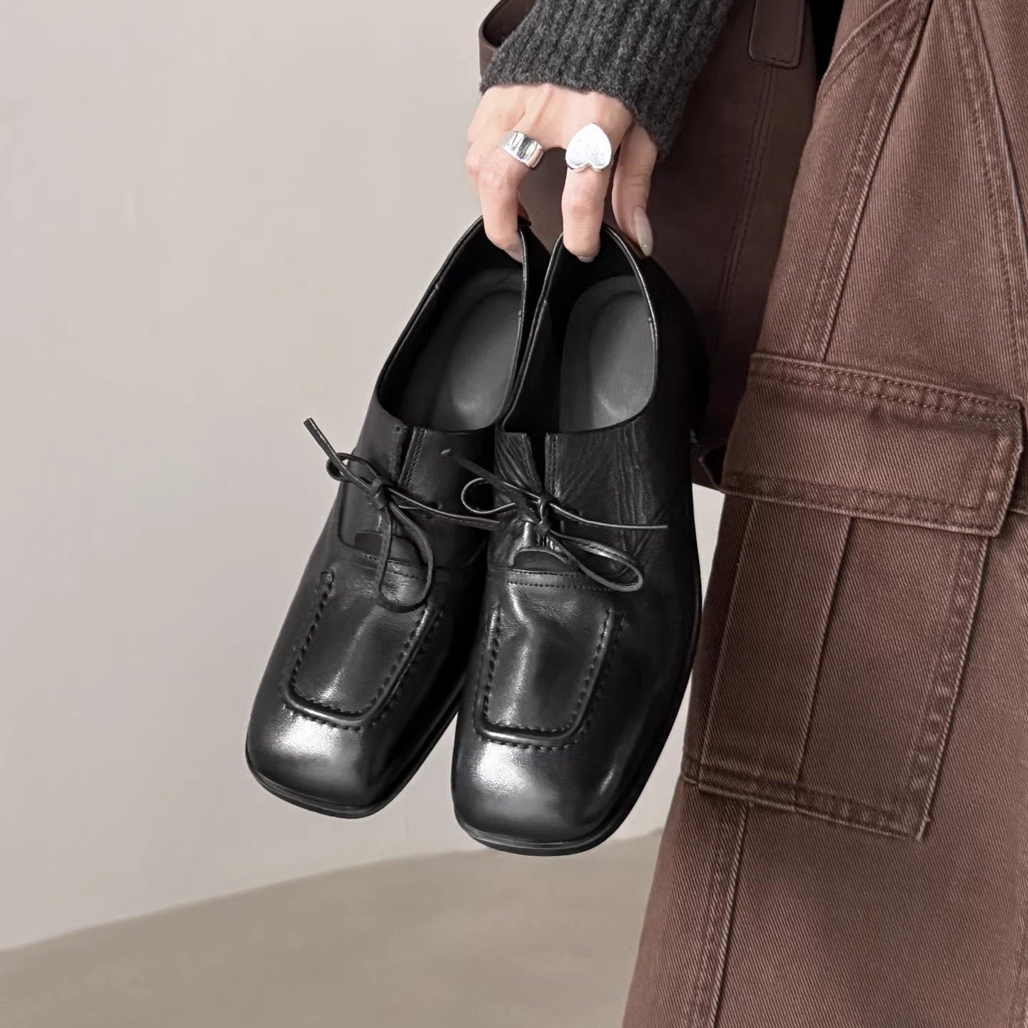 2.3cm低跟方头系带英伦风小皮鞋女粗跟深口真皮乐福女鞋黑色单鞋