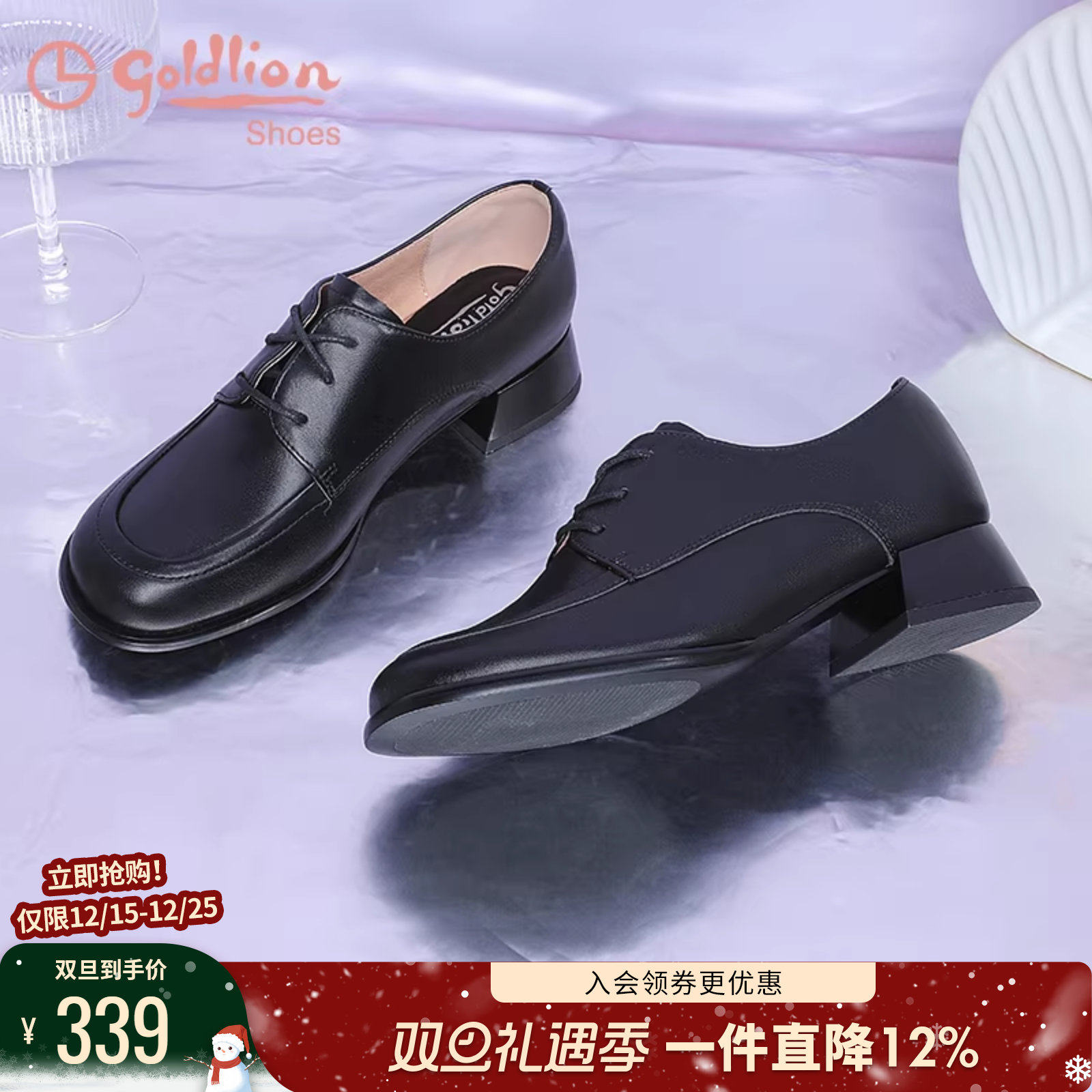 金利来黑色中跟休闲小皮鞋秋季女鞋英伦风真皮通勤粗跟深口单鞋女