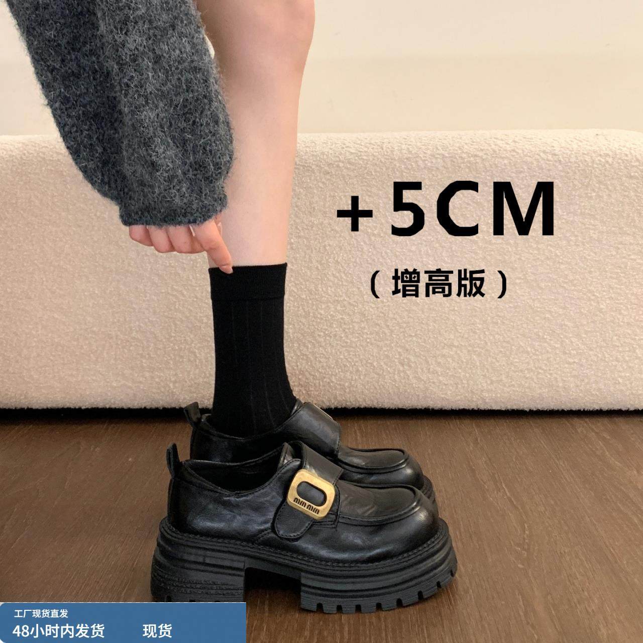 厚底乐福鞋英伦风凯旋门小皮鞋女粗跟增高鞋黑色一脚蹬真皮单鞋子