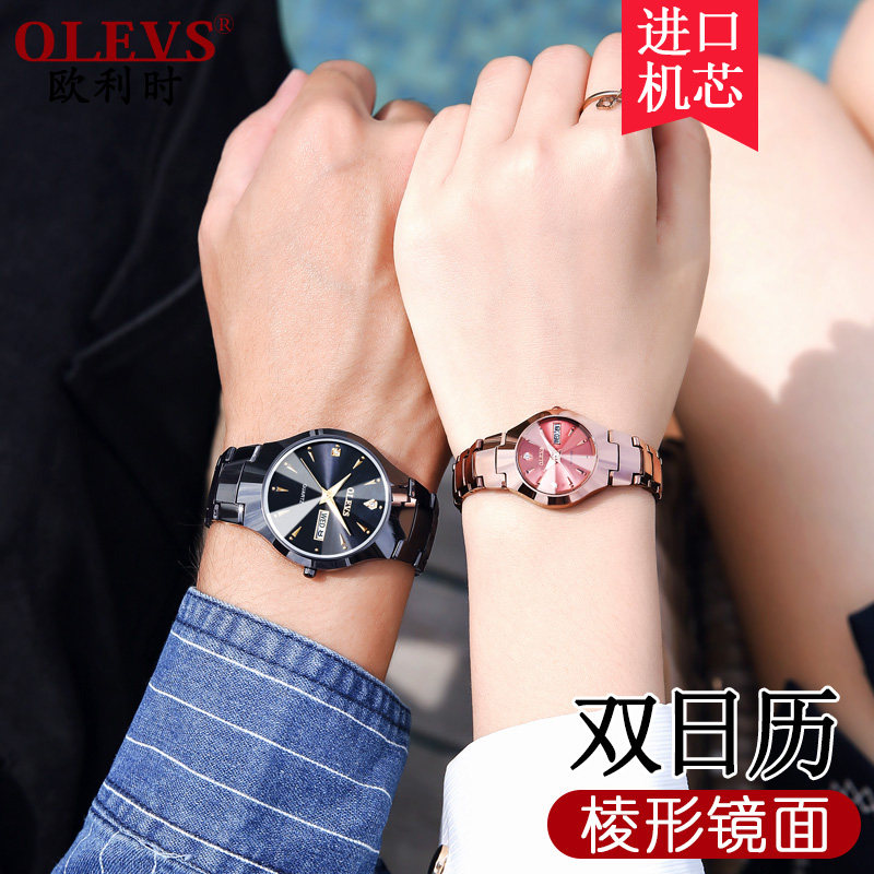 正品牌时尚韩版情侣手表一对价钨钢防水日历男士石英女表对表瑞士