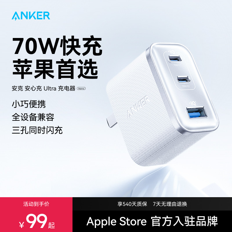 【苹果全家桶】Anker安克安心充Ultra70wMacbook充电器45W氮化镓iphone17手机PD快充头65w多口适用苹果16pro