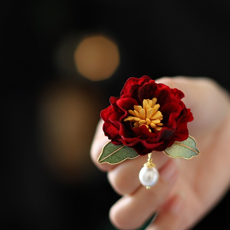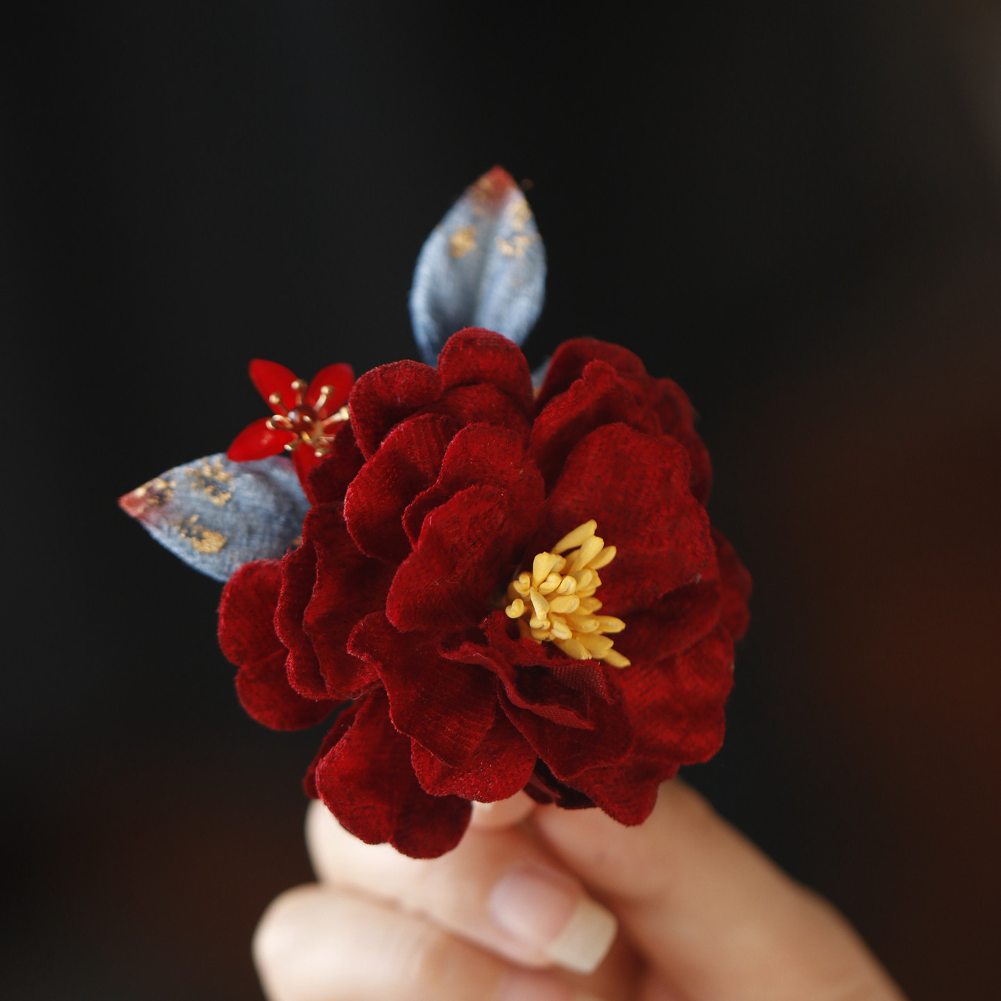 新年红色手工绢花胸针山茶花复古旗袍胸花秋冬配大衣布艺花朵别针