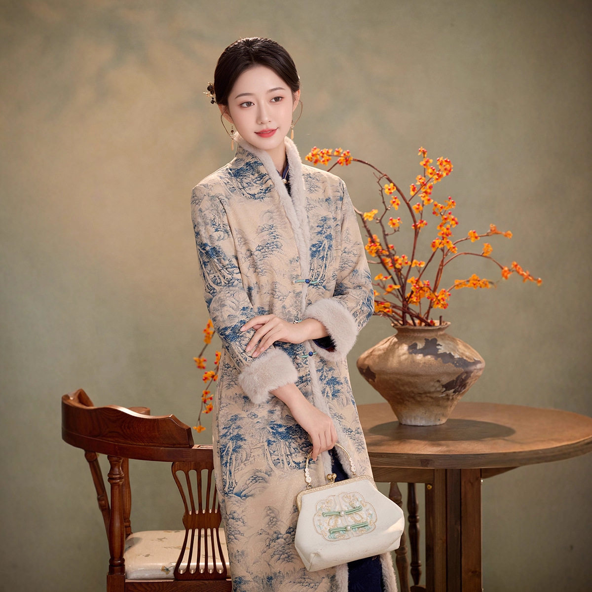 秋冬长款旗袍外搭新中式国风外披加绒加厚保暖唐装外套复古大衣女