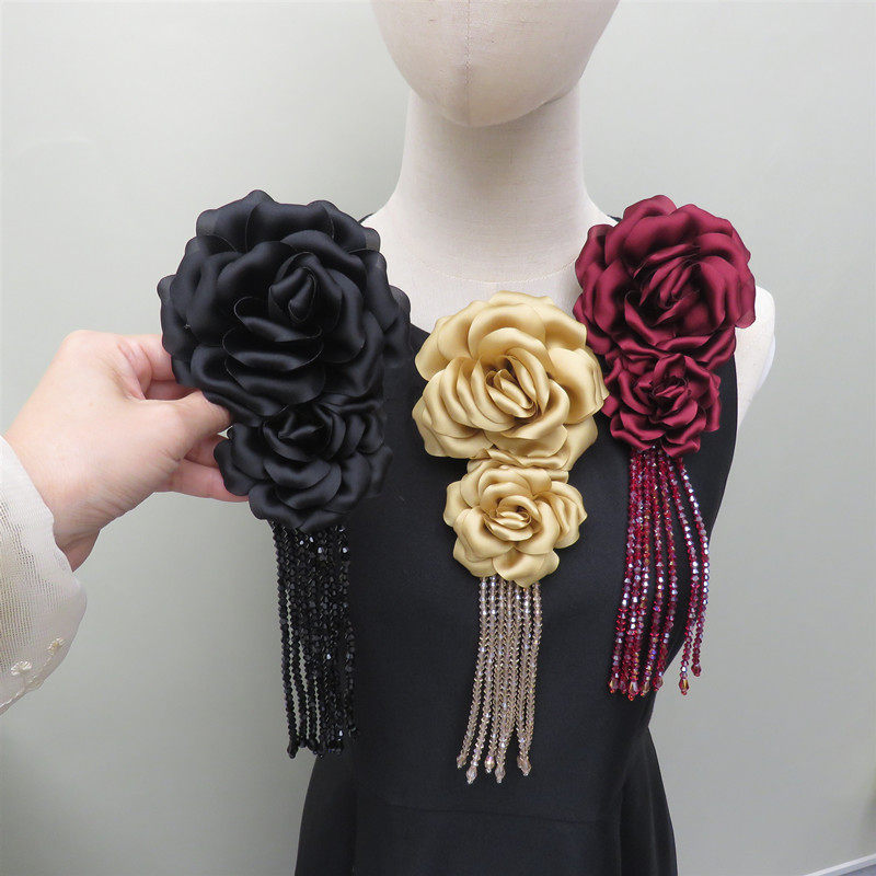 高级感气质玫瑰布艺花朵水晶钻肩章长流苏胸花别针旗袍大衣配饰品