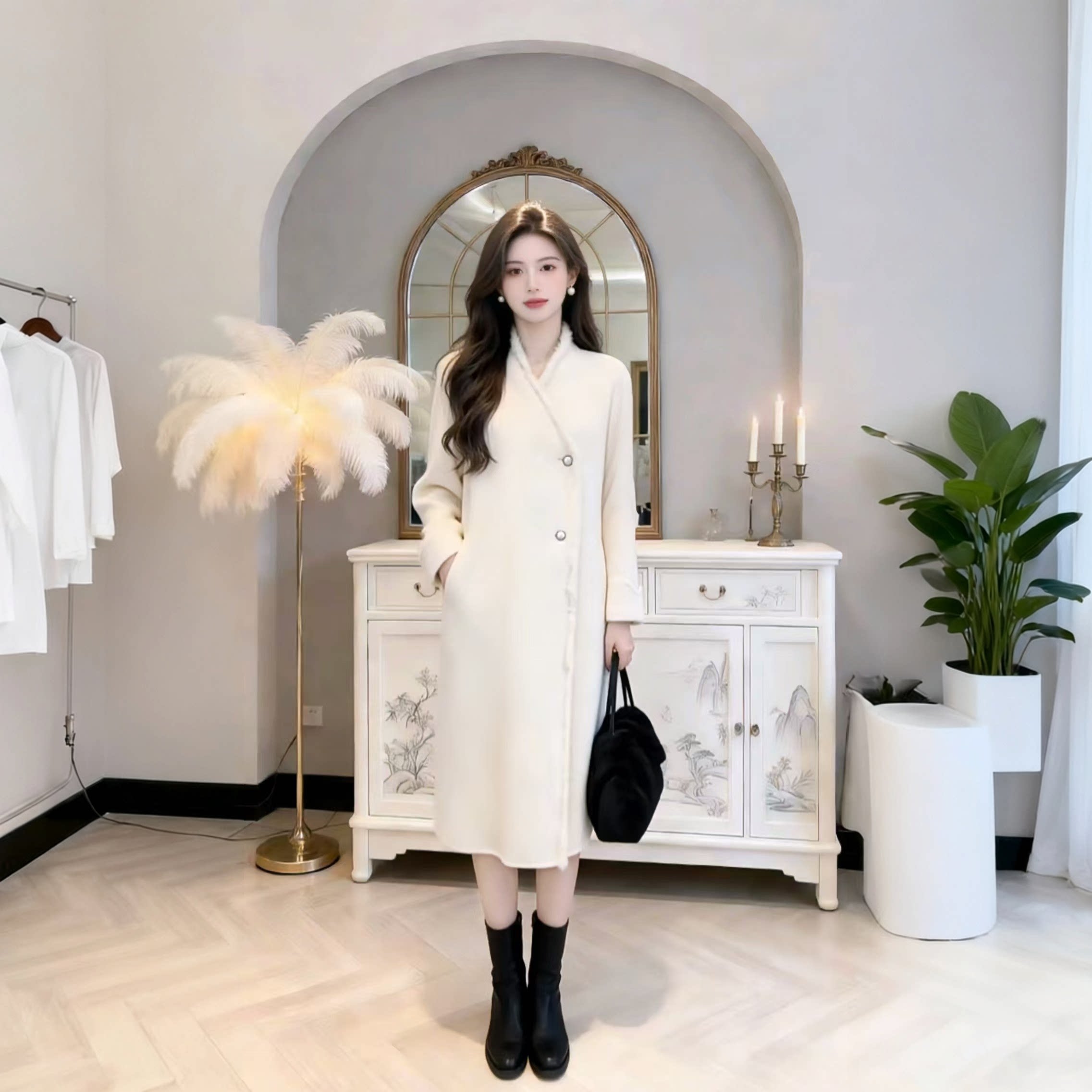 轻熟风中式改良旗袍裙名媛设计感白色连衣裙秋冬加厚大衣打底裙子