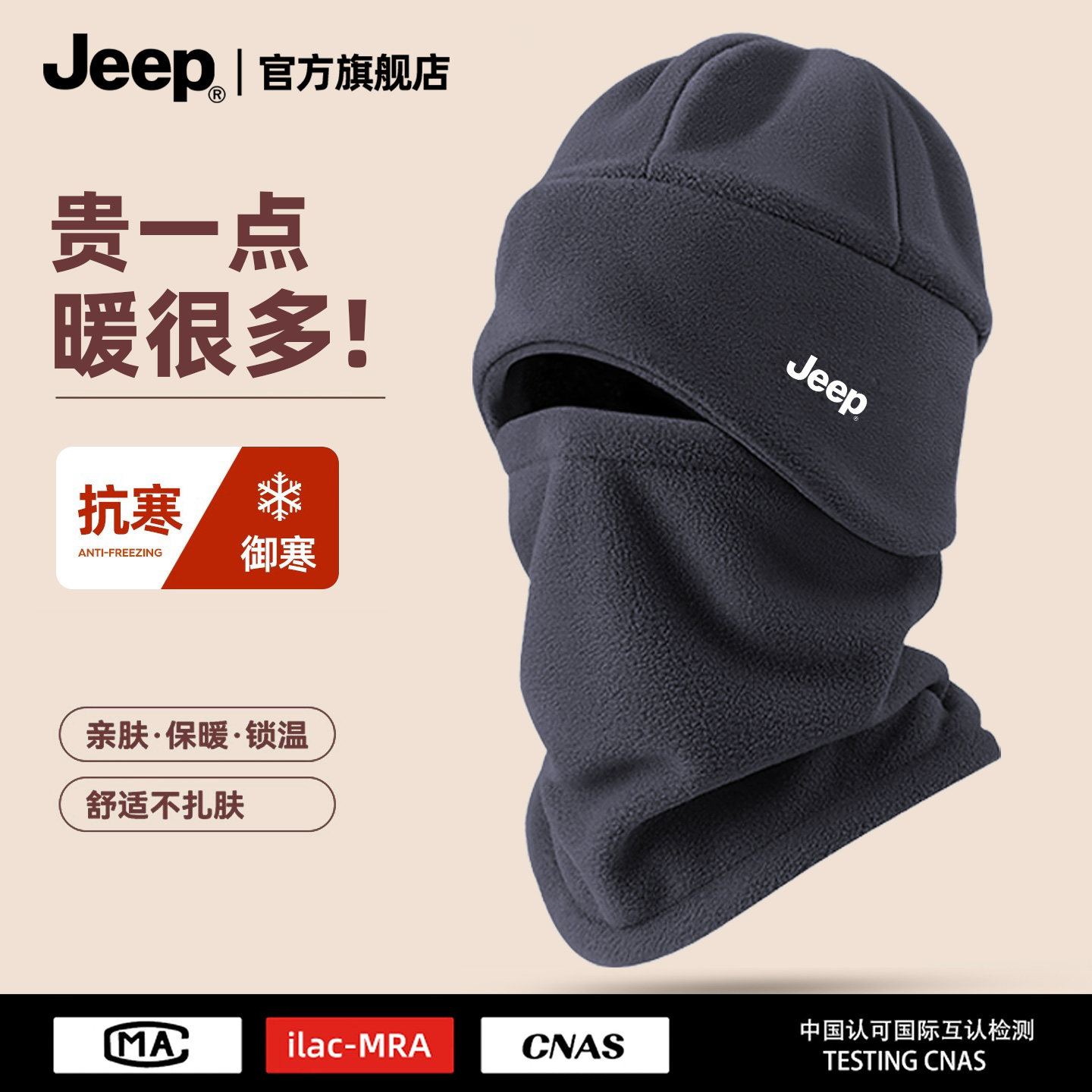 jeep吉普帽子男士冬季加绒保暖防风骑车套头帽护耳护颈围脖冬天男