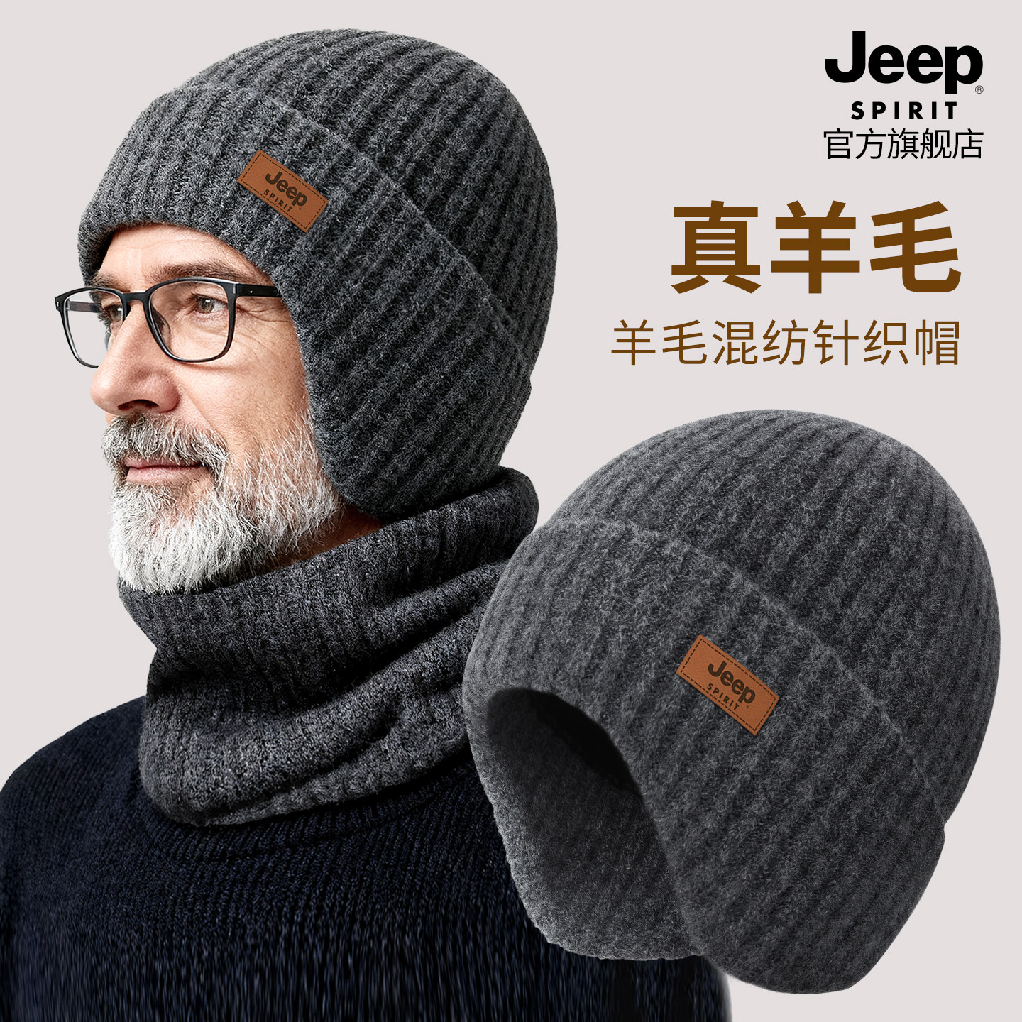 JEEP SPIRIT吉普毛线帽男冬季保暖防寒护耳羊毛混纺中老年针织帽