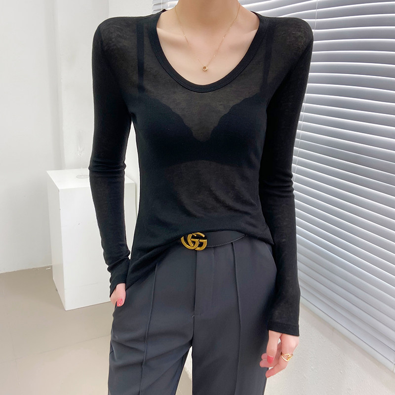 黑色低领打底衫女早春内搭网纱透视上衣u领修身薄款微透欧货t恤潮