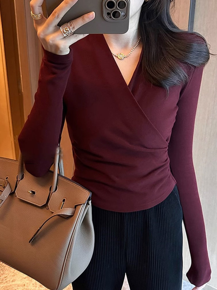秋冬内搭加绒修身v领上衣磨毛加厚高级感黑色低领打底衫女长袖t恤