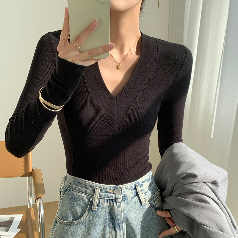 黑色长袖针织衫女大方V低领气质修身显瘦春秋毛衣打底衫内搭上衣
