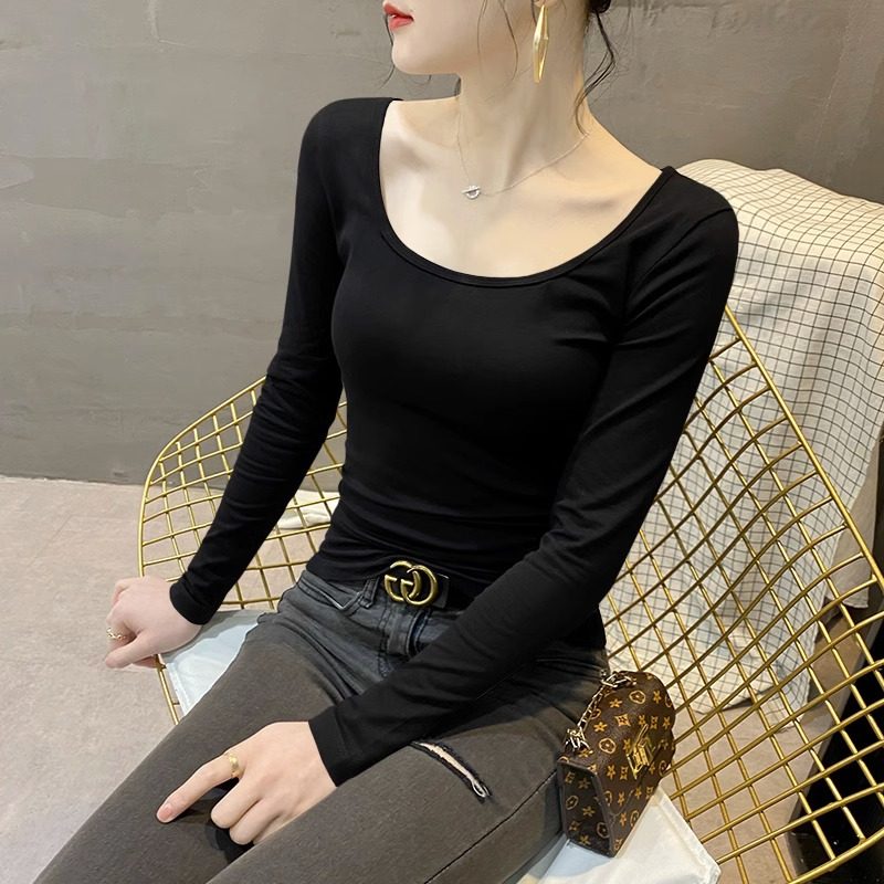 秋冬新款长袖黑色低领打底衫女U领修身纯棉内搭大领口紧身t恤上衣