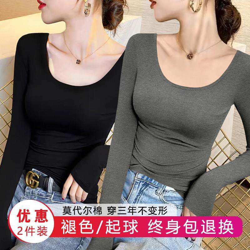 莫代尔低领打底衫女秋冬内搭黑色长袖t恤肌底衣双U领修身薄款上衣