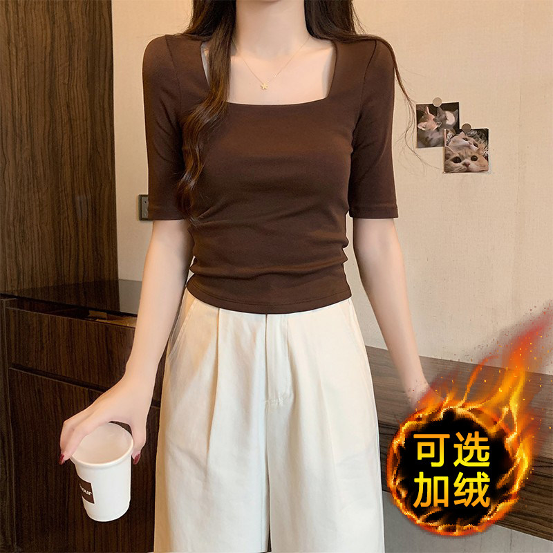 黑色短款方领长袖t恤女秋冬双面绒打底衫内搭低领加厚紧身u领上衣