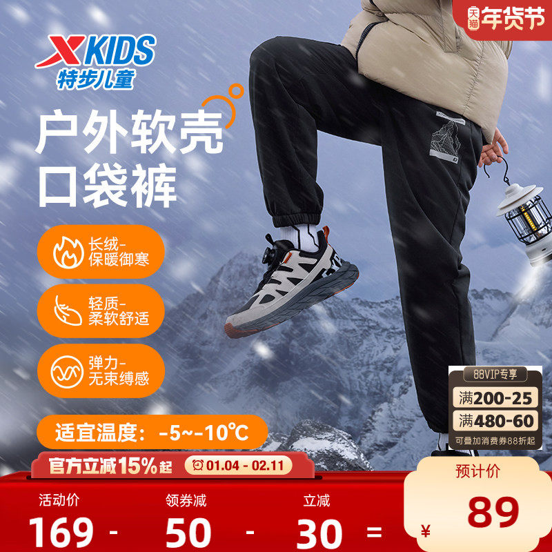 特步童装男童拼接运动裤儿童保暖长裤青少年冬季大童裤子加绒冬装