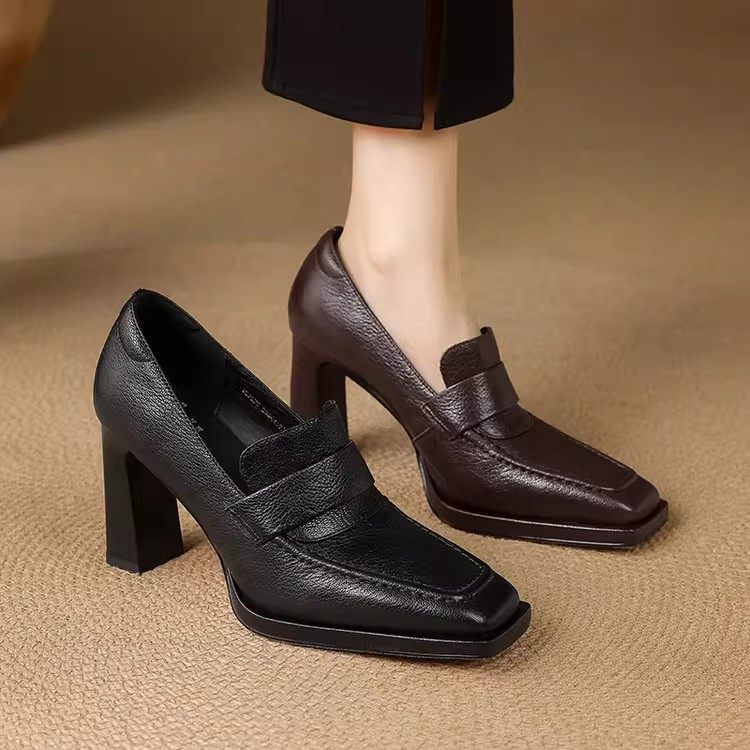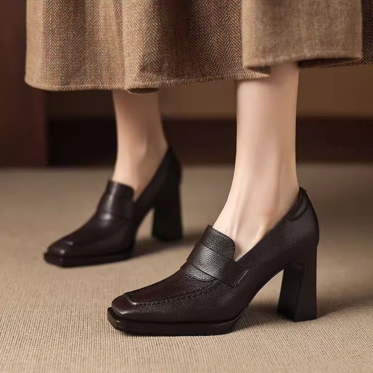 高跟鞋女2025秋冬新款真皮方头粗跟乐福鞋一脚蹬复古通勤深口单鞋