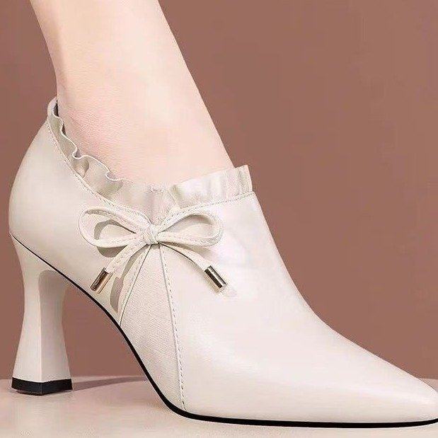 软真皮尖头深口高跟单鞋女粗跟2025新款时尚蝴蝶结百搭春秋女鞋子