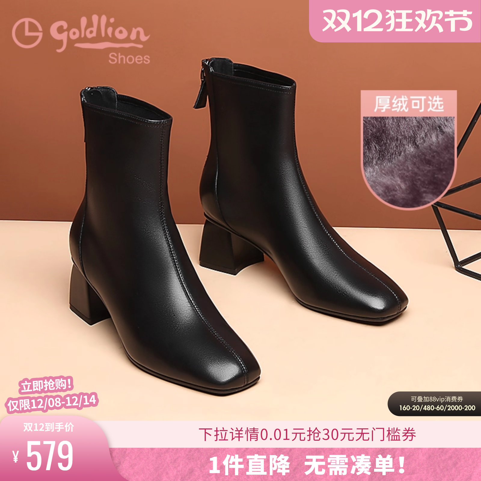 金利来加绒高跟短靴女冬季黑色女靴中筒方头粗跟瘦瘦皮靴真皮裸靴