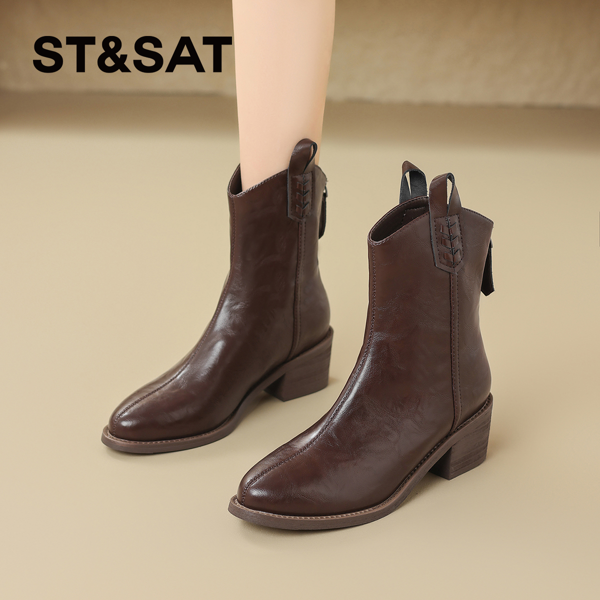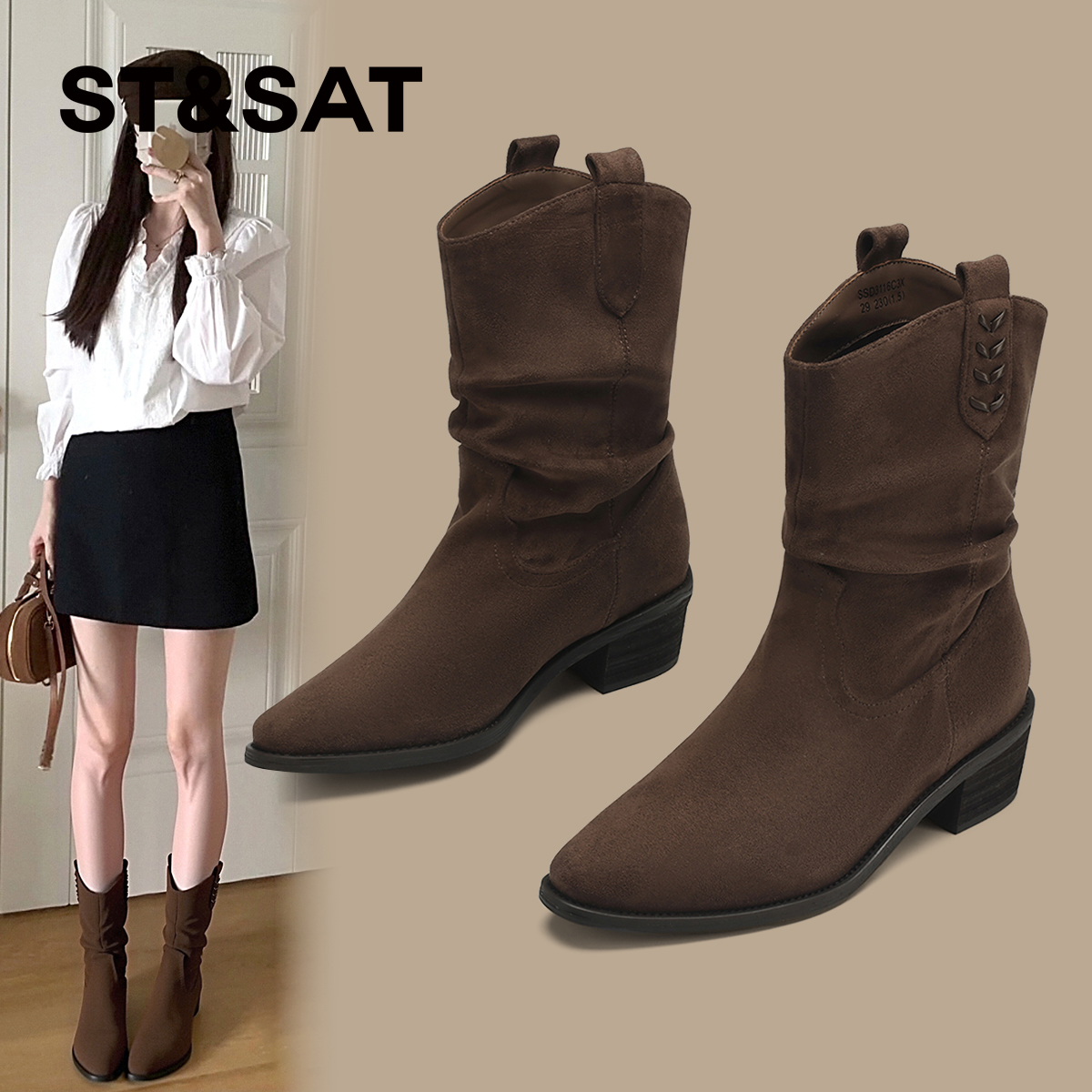 星期六棕色靴子美拉德尖头西部牛仔靴女复古中筒短靴高跟皮靴女靴