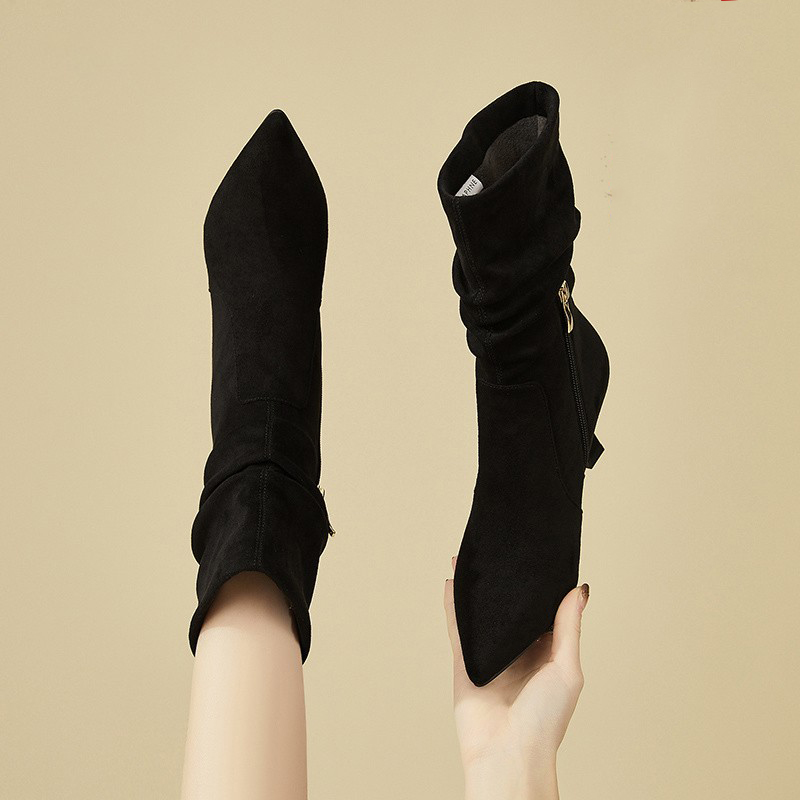 中筒靴女靴子秋冬季2025新款侧拉链尖头加绒短靴高跟鞋绒面堆堆靴