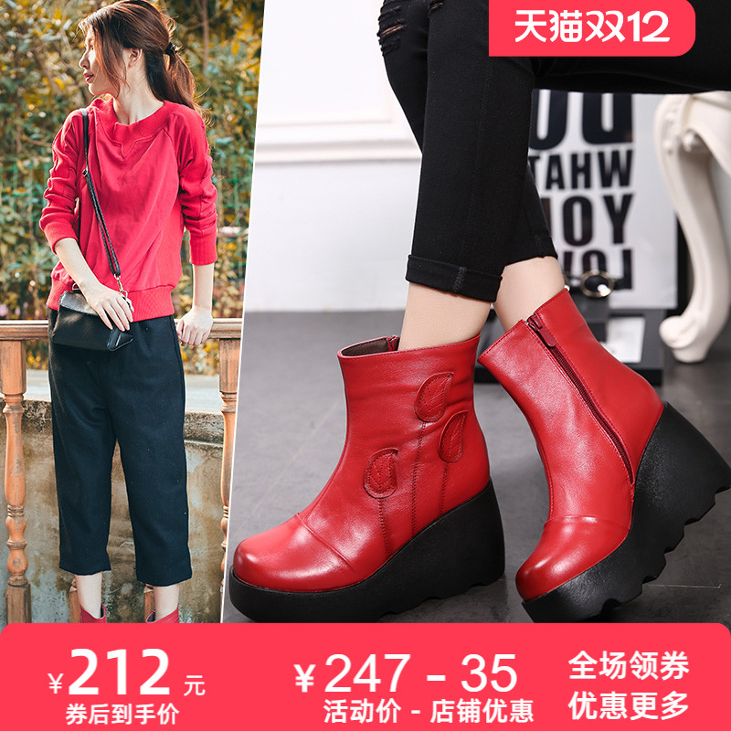 2025冬新款厚底坡跟牛皮女靴中筒靴子舒适坡高跟休闲圆头女鞋皮鞋