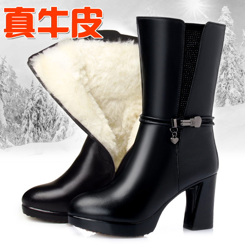 高跟真皮靴子女士中筒靴冬季保暖中年女靴加厚羊毛皮靴妈妈大棉靴