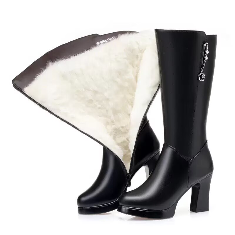 冬季羊毛女靴高跟中筒靴粗跟马靴加绒棉鞋真皮骑士靴女保暖棉靴子