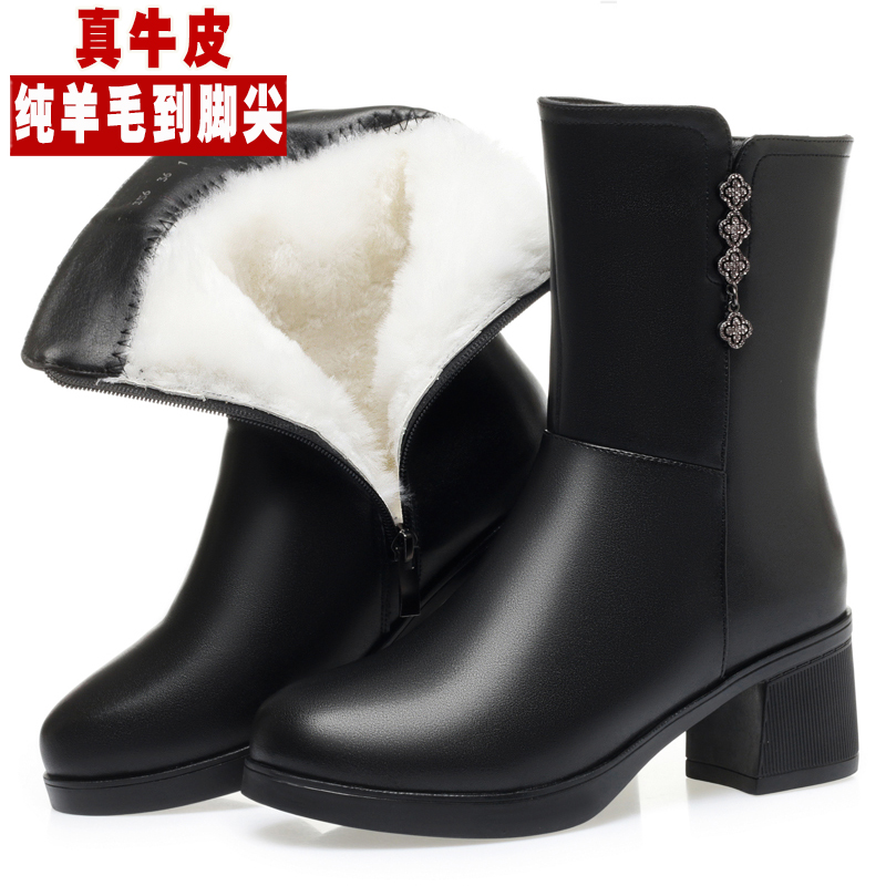 冬季羊毛女靴高跟真皮中筒靴女粗跟中年加厚棉鞋大码棉靴加绒保暖