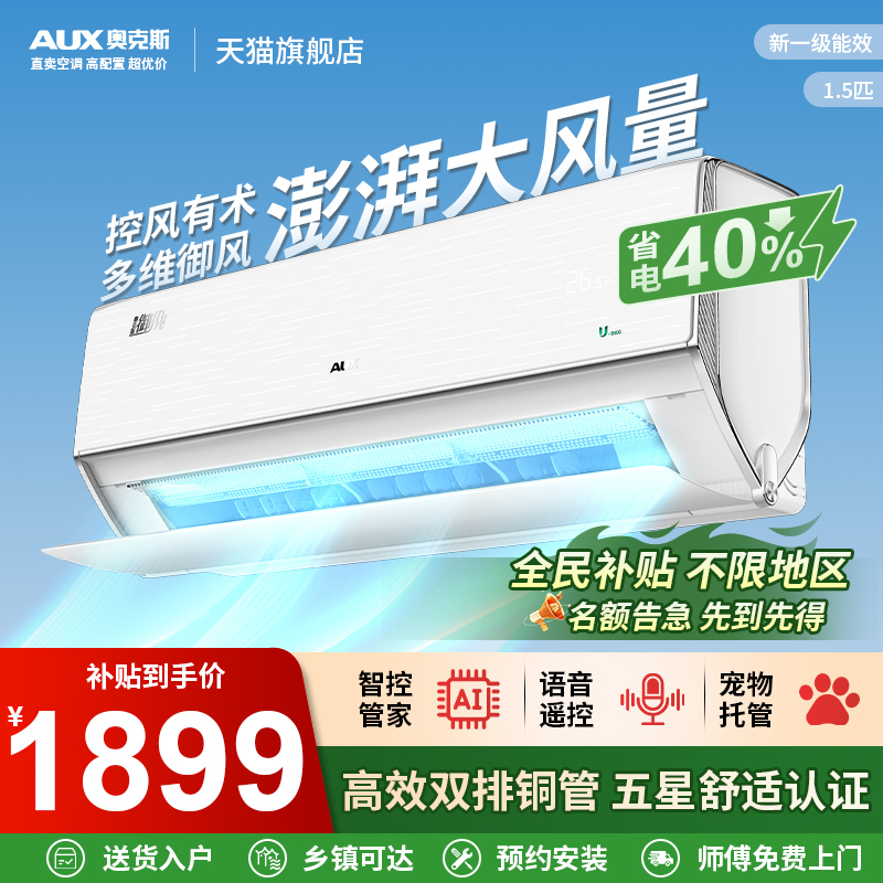 AUX/奥克斯空调大1.5匹一级挂机变频冷暖家用卧室正品百亿补贴