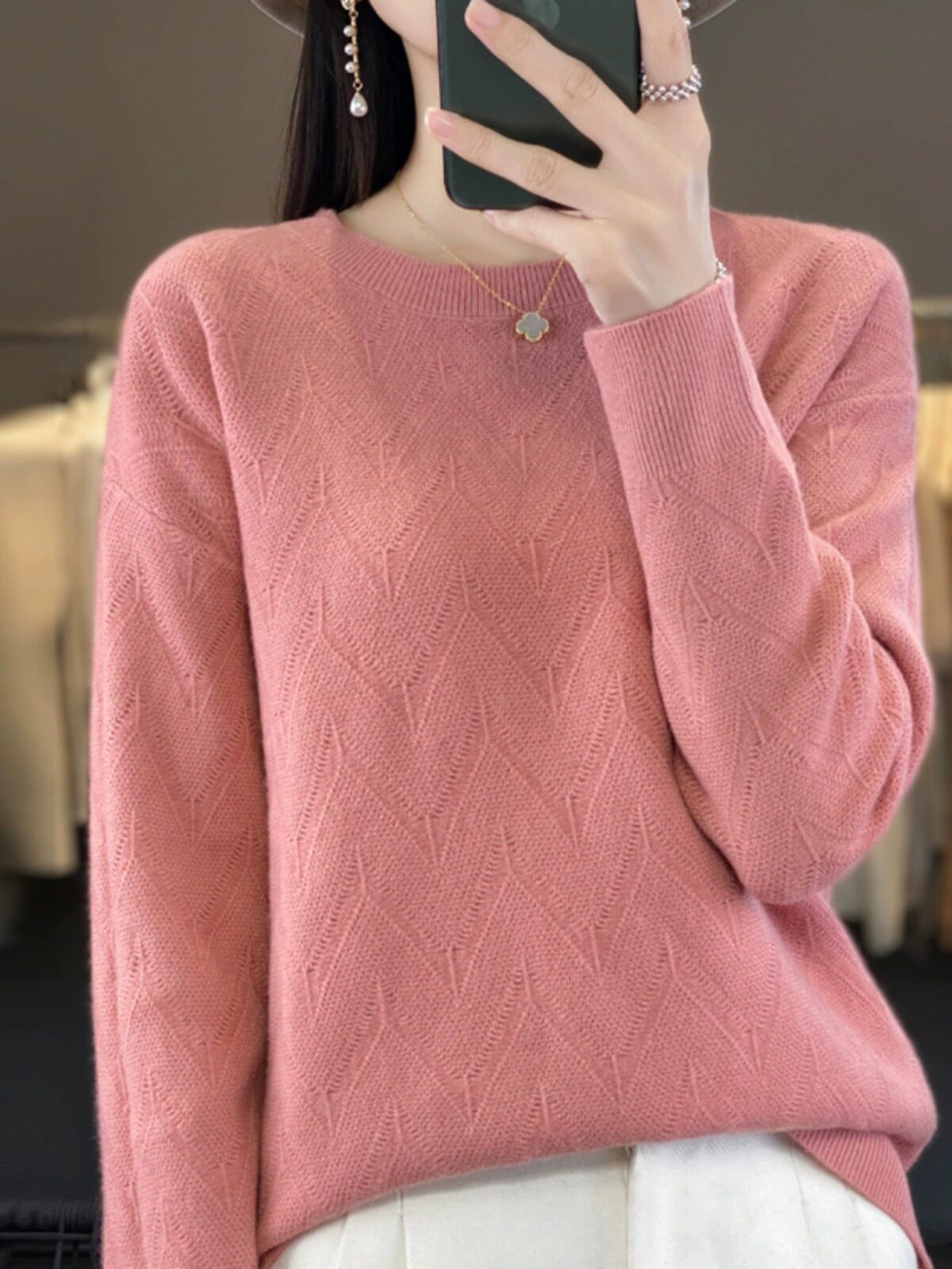 新款秋冬季100纯羊毛女士低圆领百搭毛衣套头宽松秋冬针织打底衫