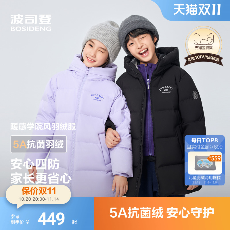 波司登2025冬季新款男童女童中长款运动连帽儿童羽绒服保暖加厚