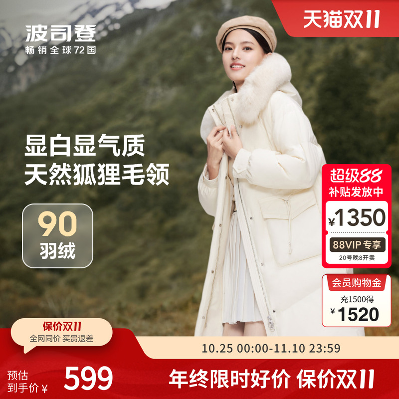 波司登2023冬女士中长款宽松廓形外套狐狸毛领连帽奢华羽绒服