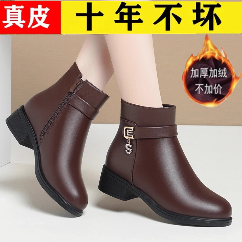 妈妈棉鞋真皮软底短靴单靴女士棉皮鞋中年中跟靴子中老年女鞋棉靴
