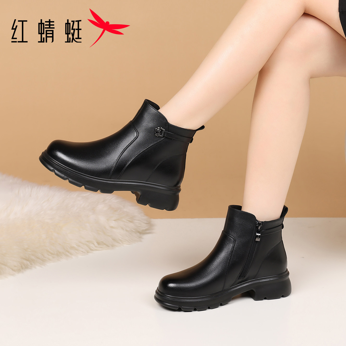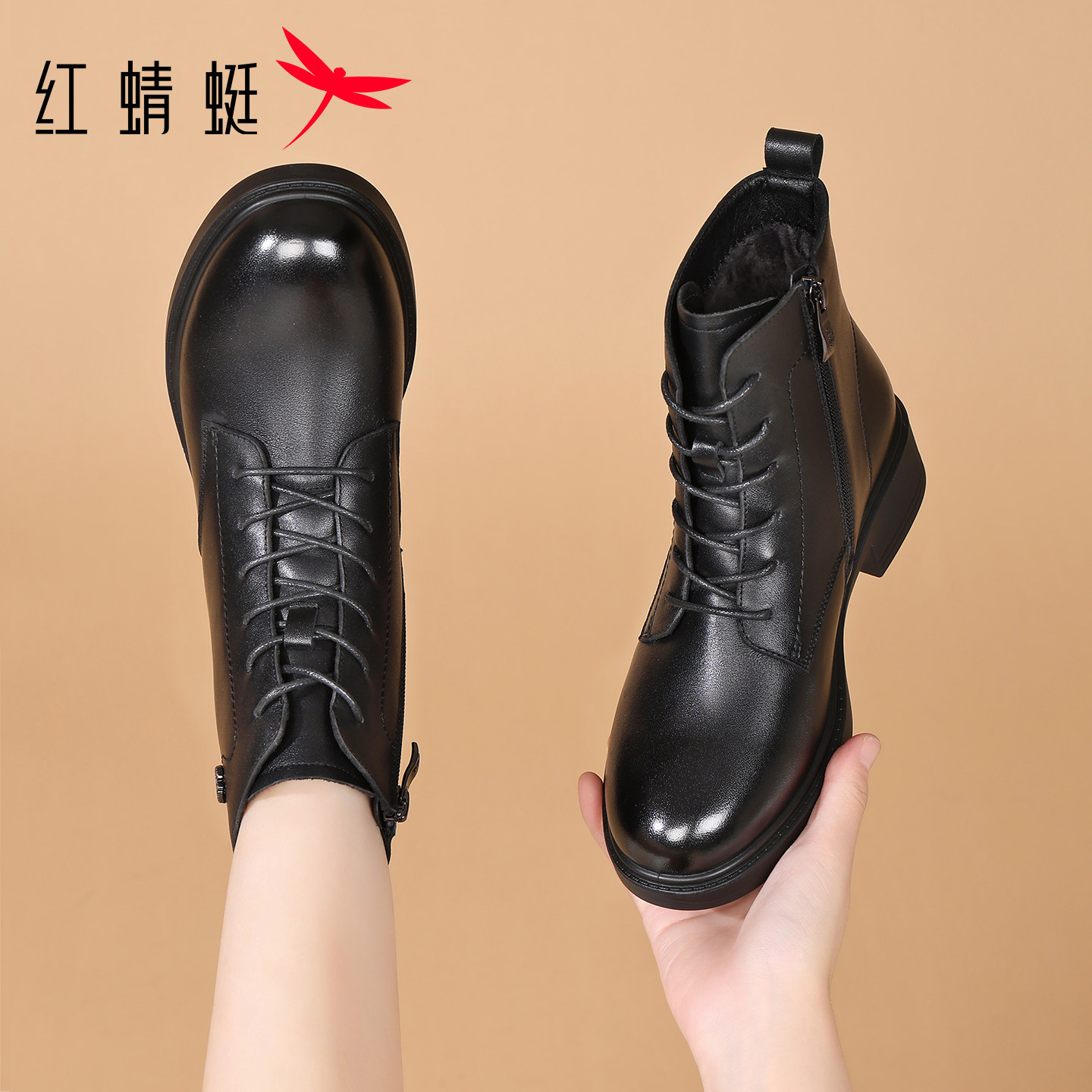 红蜻蜓女鞋冬季真皮靴子女士靴子马丁靴女头层牛皮加绒短靴英伦风