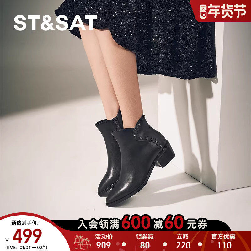 星期六时装靴2024新款粗跟百搭侧拉链铆钉短靴女士靴子SSC4116424