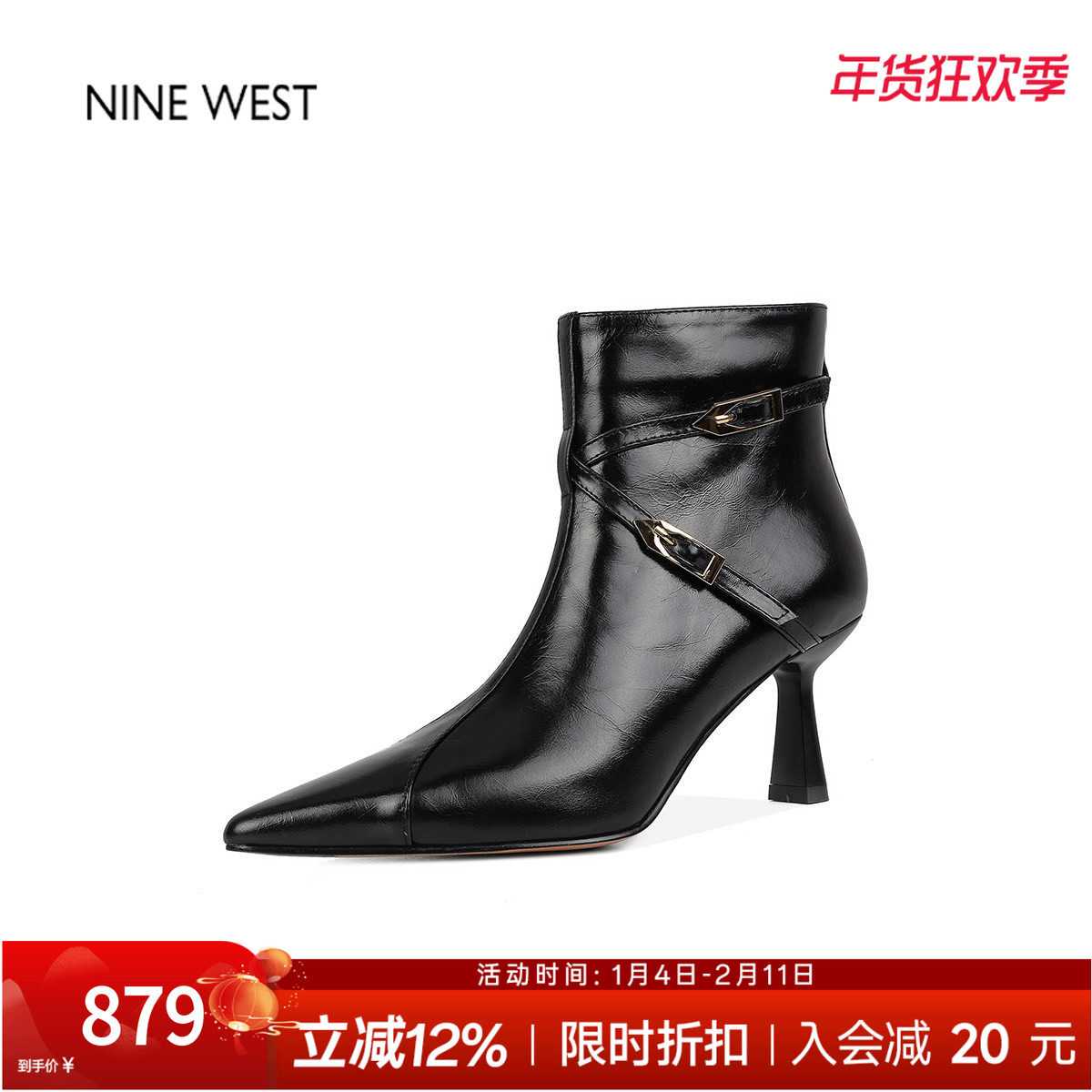 奥莱专供Nine West/玖熙尖头皮带扣弹力瘦瘦靴高跟短靴女士靴子冬